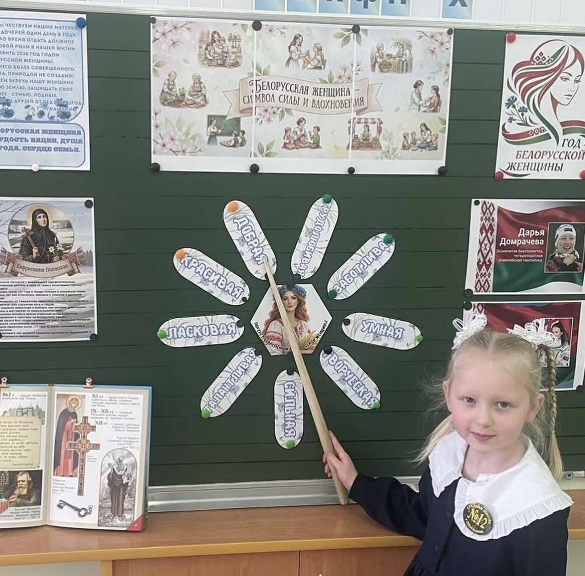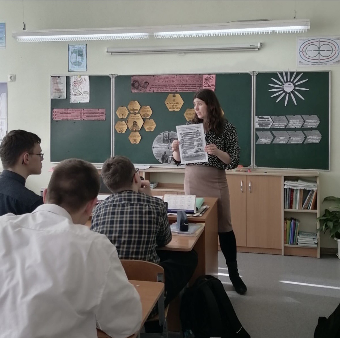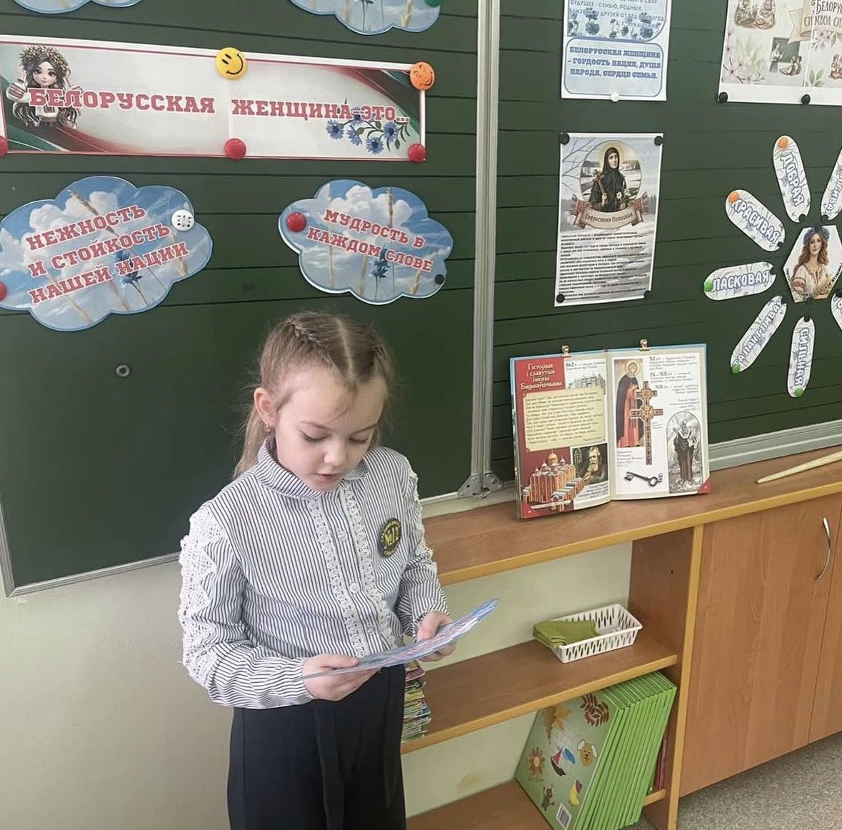 На уроке ребята узнали о знаменитых белорусcких женщинах: от Ефросиньи Полоцкой до наших современниц — учителей, врачей, матерей-героинь. Мы вспомнили, какой ценой женщины сохраняли мир в годы войны и как сегодня они строят будущее Беларуси.
