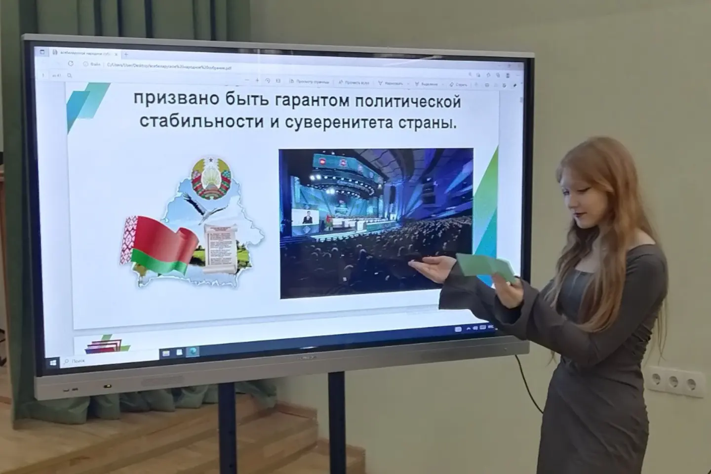 В рамках информационно - образовательного проекта "ШАГ - Школа Активного Гражданина" учащиеся 8 класса подготовили выступление и презентацию по теме "VII Всебелорусское народное собрание - главное политическое событие года". После выступления ребятам была предложена интерактивная викторина "Мы узнаем".